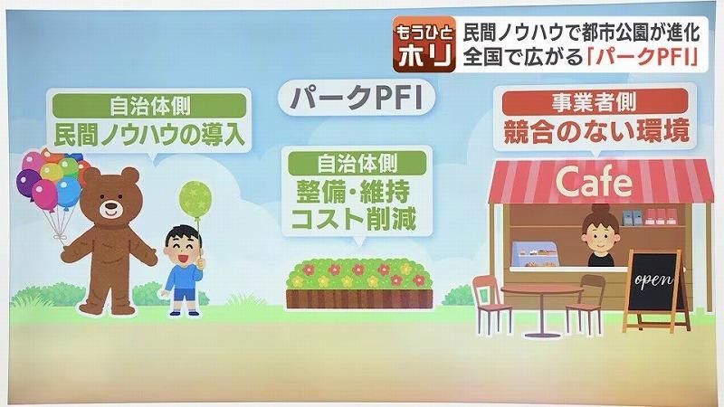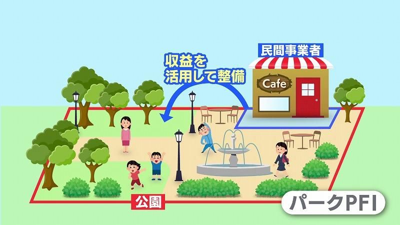 『パークPFI』とは、自治体が公募で選んだ『民間事業者』に公園の土地を有償で貸し出して、飲食店などを出店してもらい、その収益の一部を公園の整備に充てる仕組みです。