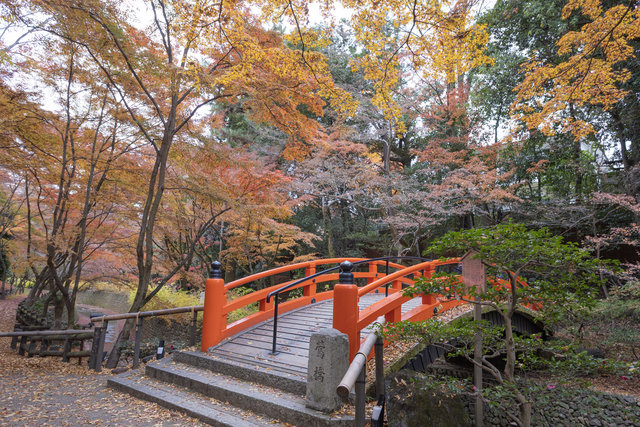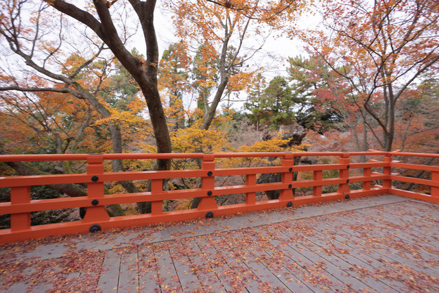茶室梅交軒に設けられた舞台です。色とりどりの紅葉、朱色の欄干、床に落ちた紅葉も美しい風景です。