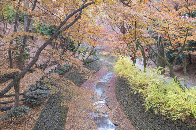 鶯橋から見た風景です。木に残った紅葉と、散った紅葉が川沿いに敷き詰められた見事な風景。川にも少し紅葉が映り込んでいました。