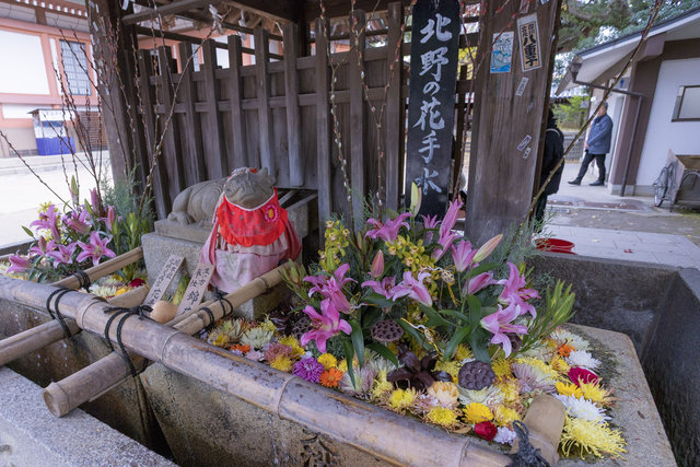 境内の北野の花手水です。ユリが印象的な美しい花手水でした。