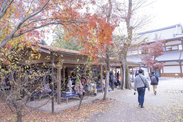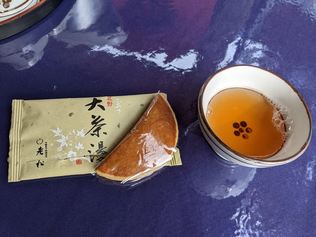 京都老舗和菓子屋「老松」の大茶湯と、ほうじ茶がいただけます。利休居士が考案したと伝わる麩の焼を再現したお菓子で、とても美味しかったです。散策の後に、程よい甘さの和菓子とお茶がいただけて、こちらでも良い時間が過ごせました。