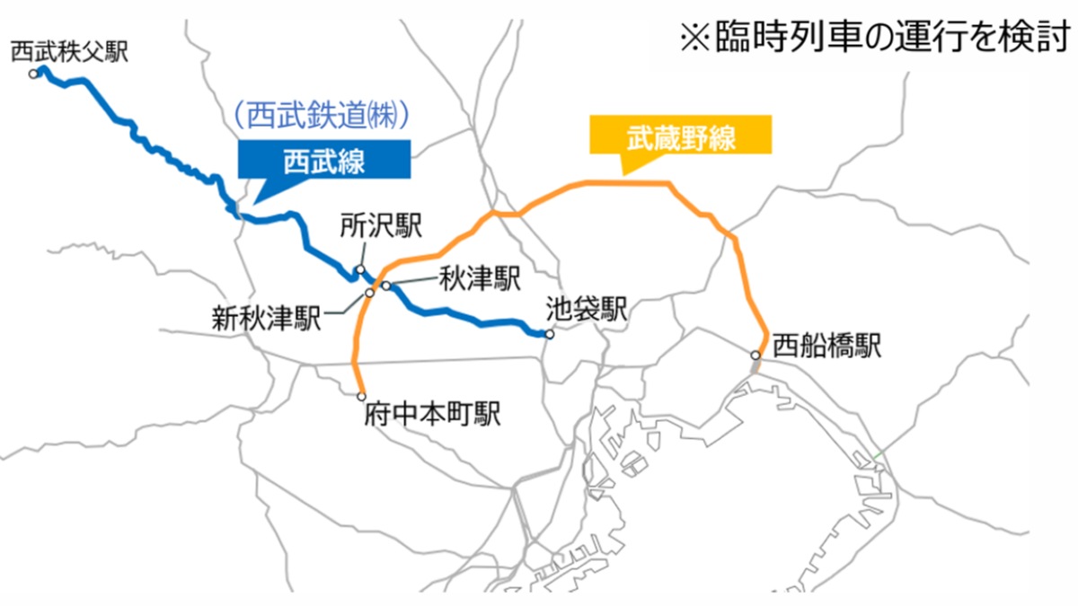 また、東京駅や蘇我駅・千葉みなと駅など京葉線沿線を出発して、西武沿線のプロ野球・西武ライオンズの本拠地「ベルーナドーム」や「西武園ゆうえんち」、「秩父」などの観光・レジャー施設に向かうための臨時列車の運行が想定されます。