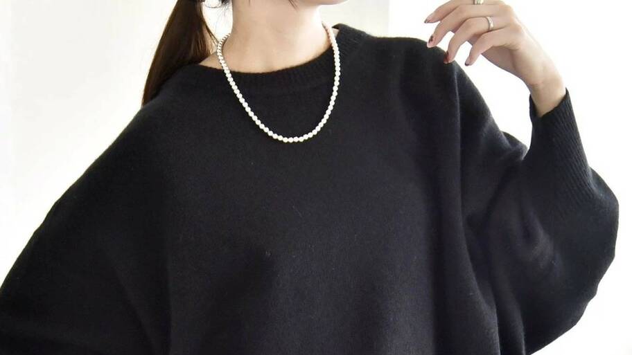 グレーの長袖トップスにベージュのワイドパンツを合わせたベーシックカラーの着こなしは安心感がありますが、地味見えしてしまうと感じていませんか?