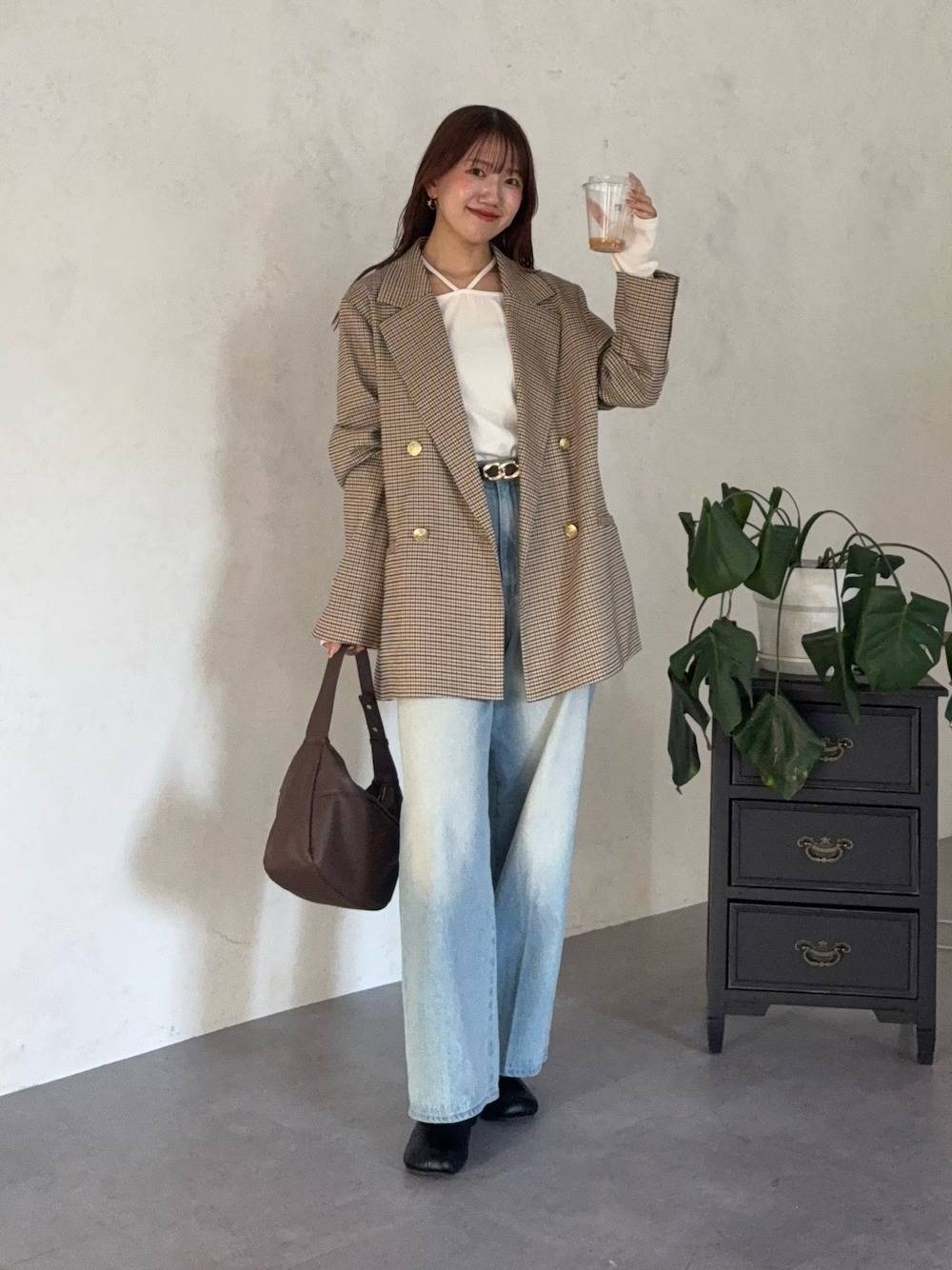 【10月編】今っぽいパンツコーデ①チェック柄ジャケット×デニムパンツ