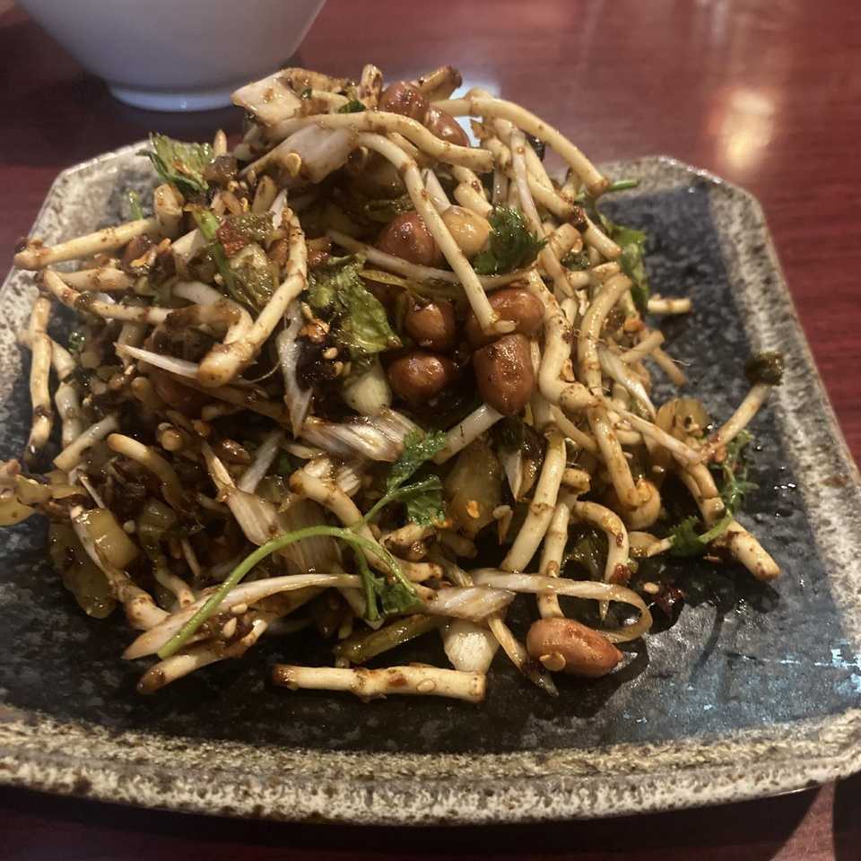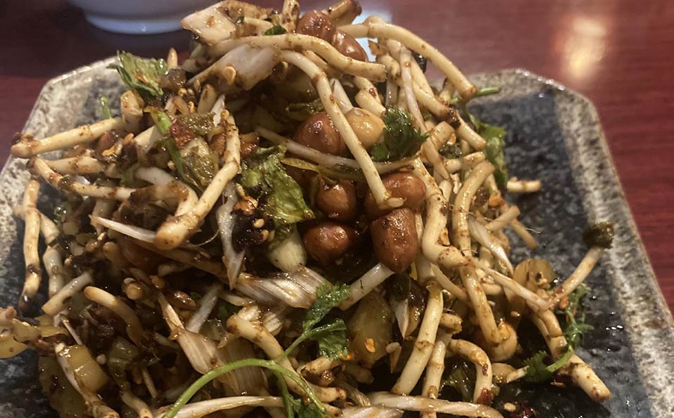 実は貴州料理は辛いと聞いていて、辛さはそれなりに平気な私でも、どんな辛さなのかちょっとドキドキしていました。でもゆっくり噛んでみるとパクチーや酸っぱい青菜の味も混ざり、ただ辛いだけではありません。ピーナツも入っていて、ドクダミの根の食感だけで終わらないのも面白いです。酸っぱい青菜は発酵されたものと後で知りました。