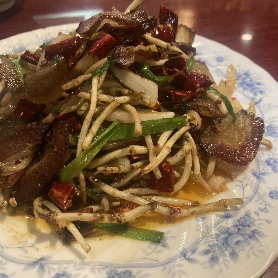 腊肉炒折耳根(燻製肉とドクダミの茎炒め)