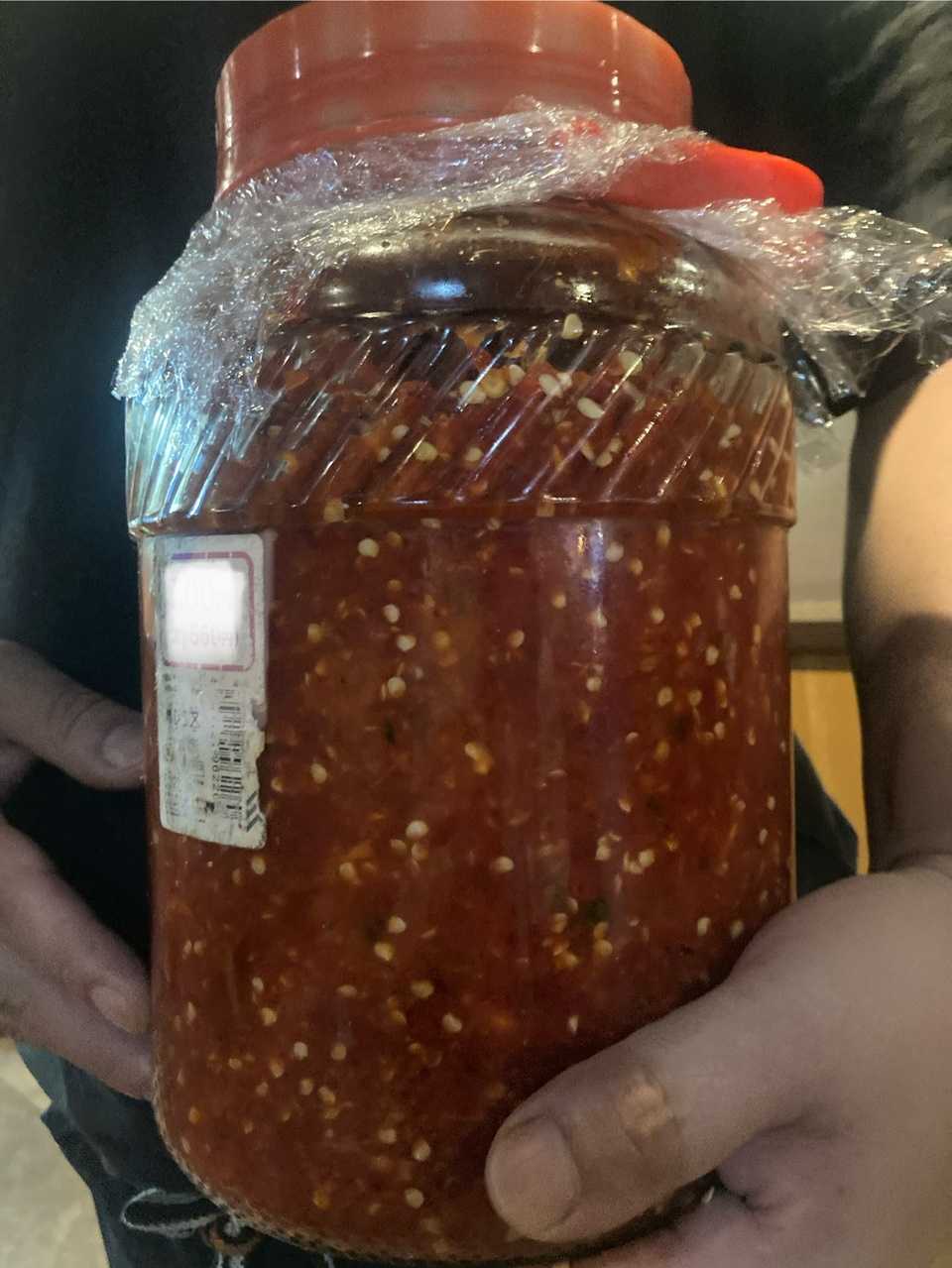 ※大量に入った刻まれた 糟辣椒。1か月経つと食べ始められる
