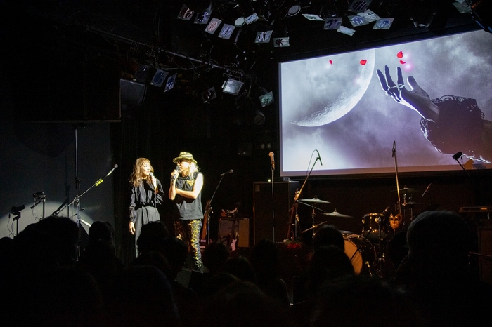DER ZIBETを愛するメンバーたちが集結したライブは一部、二部制。一部ではスクリーンにアルバムのジャケットから派生したアートワークが映し出され、新曲7曲がダイジェストでいち早くファンに届けられた。そして、ステージにHIKARUとちわきまゆみが登場し、アルバムについてのトークセッション。制作途中だったアルバムの楽曲たちをどうするか葛藤していたHIKARUを音源化に踏み切らせたのは“期せずしてトリビュート・アルバムの記念ライブを仕切り、参加することになったからだ”というエピソードや、タイトルはいつもISSAYと飲みながら話す中で生まれていたこと。「ISSAYなら漢字を使うだろうな」と“句点”という言葉を選んだことなどが明かされた。