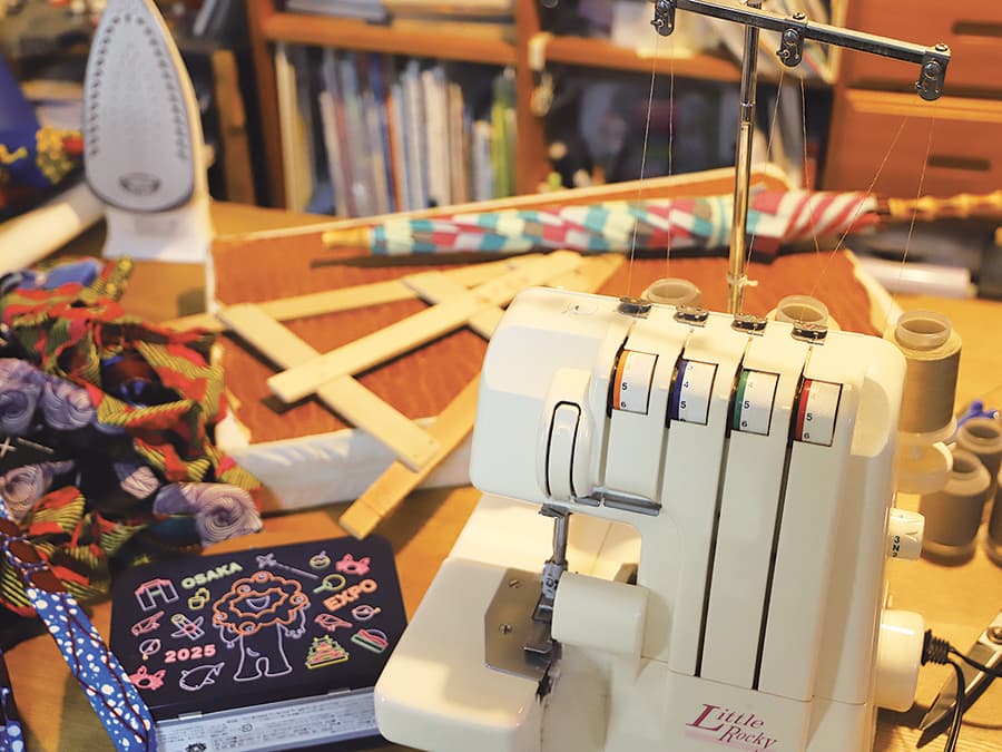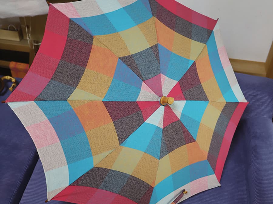 日傘を手掛けるきっかけは大学の恩師からもらったアフリカンプリントと呼ばれる綿生地だった。鮮やかな幾何学模様などを描く生地に、衣服に仕立てるには色が派手すぎると感じ、活用方法を模索するうち日傘と組み合わせるアイデアを思い付いた。
