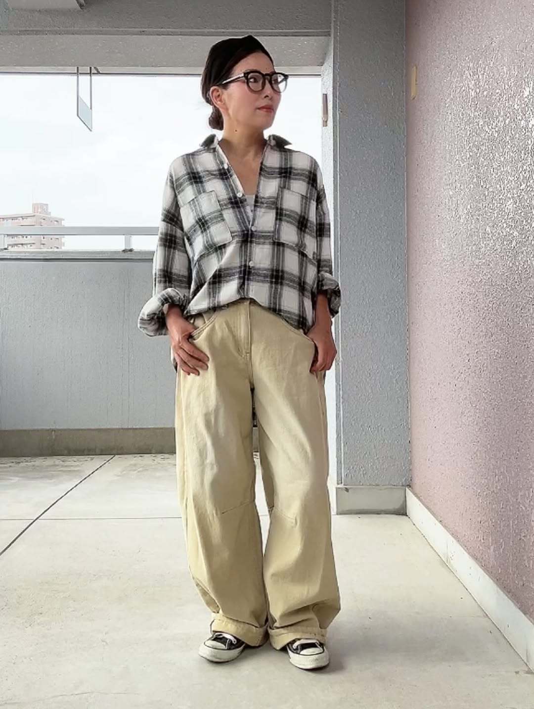 チェック柄シャツとアイボリーのワイドパンツのカジュアルな組み合わせ。