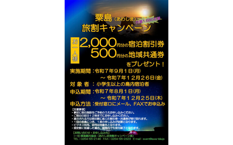 小学生以上が対象で、秋の粟島をお得に満喫できるチャンスです。