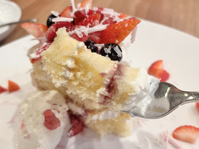 手作りのケーキはスポンジ生地がふわふわでやさしい口当たり。クリームも甘さ控えめで軽く、どこか“ほっとする”味わいです。生地の間には ラズベリーのソースが薄く塗られており、甘酸っぱさが良いアクセントに。