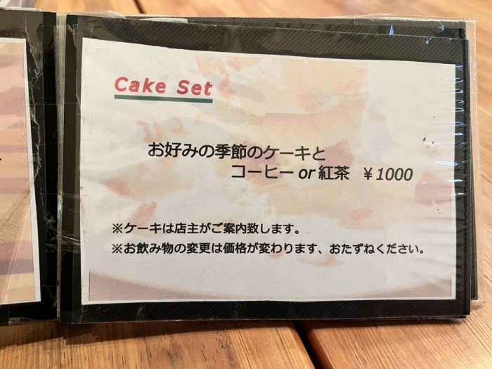 最近は物価高の影響もあり、街のカフェではケーキ単品でも1,000円に迫る価格が珍しくなくなってきました。そんな中で、同店では 「ケーキセット」がドリンク付きで1,000円 という驚きの良心価格です。