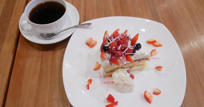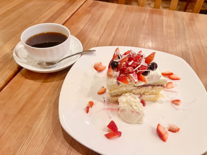 オーナーが丁寧に淹れてくださったコーヒーとの相性も抜群。ケーキとコーヒーがお互いの良さを引き立て合い、一口ごとに幸せな味わいが広がります。