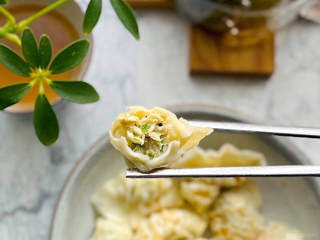 小ぶりながらも、中には肉や野菜がギュッと凝縮した餡がぎっしり。特徴的な具材の豆腐は強くは感じませんが、フワッとした口あたりは豆腐効果でしょうか。
