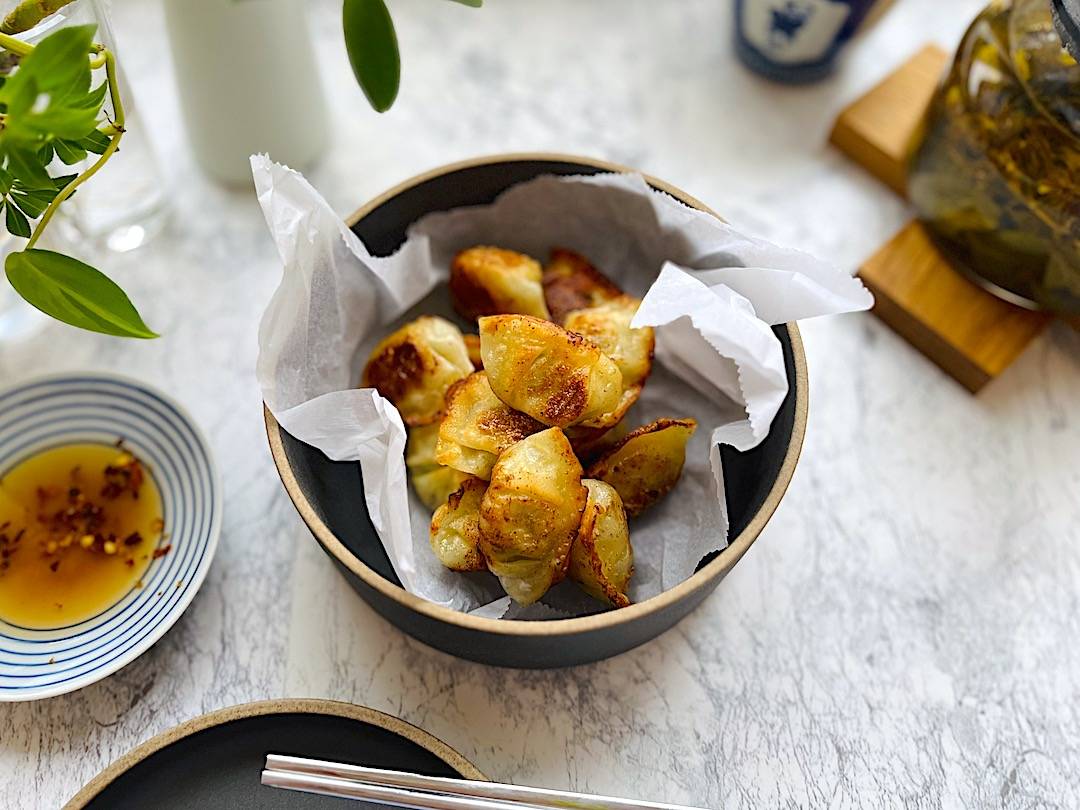 こちらがまた絶品!餃子の皮のカリカリ食感が最高で、むしろ主役の風格。中の餡はジューシーで、いっそう味がしっかりした印象ですよ。まるでスナック感覚と言えるほどの勢いで手が伸び、止まらないおいしさです。これを作るならぜひビールのご用意を。