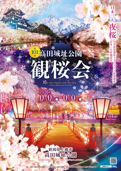 観桜会の幻想的なライトアップと西堀橋やさくらロード、高田城三重櫓、残雪の妙高山など、会場の高田城址公園の魅力を印象的に伝えるデザインとなっている。
