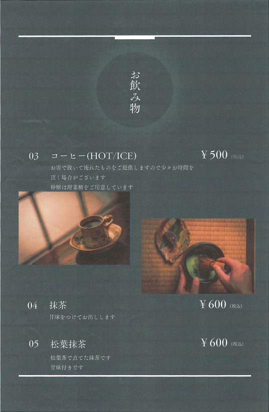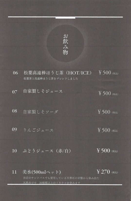 伊那市と大鹿村の中間にあるパワースポット・分杭峠周辺の標高1200mで育った上質な高遠産赤松から作った「松葉茶(ICE/HOT)」(500円)。「さわやかな香りが特長で、デトックス効果やリラックス効果があると言われています」と伊藤さん。