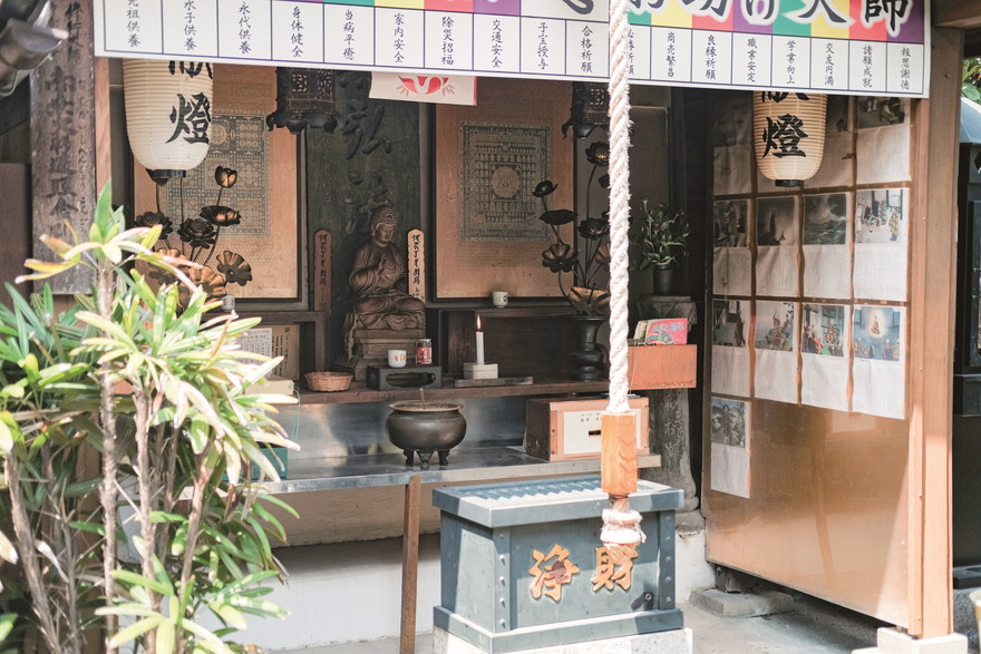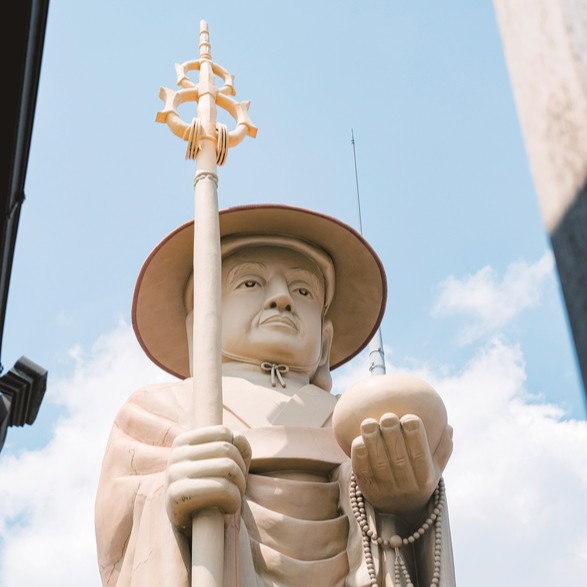 「カフェ 百時」からさらに弘法通りを進んでお寺へ続く路地に入れば、やわらかな表情ながらも凛とたたずむ大弘法さまの姿が見えてきます。