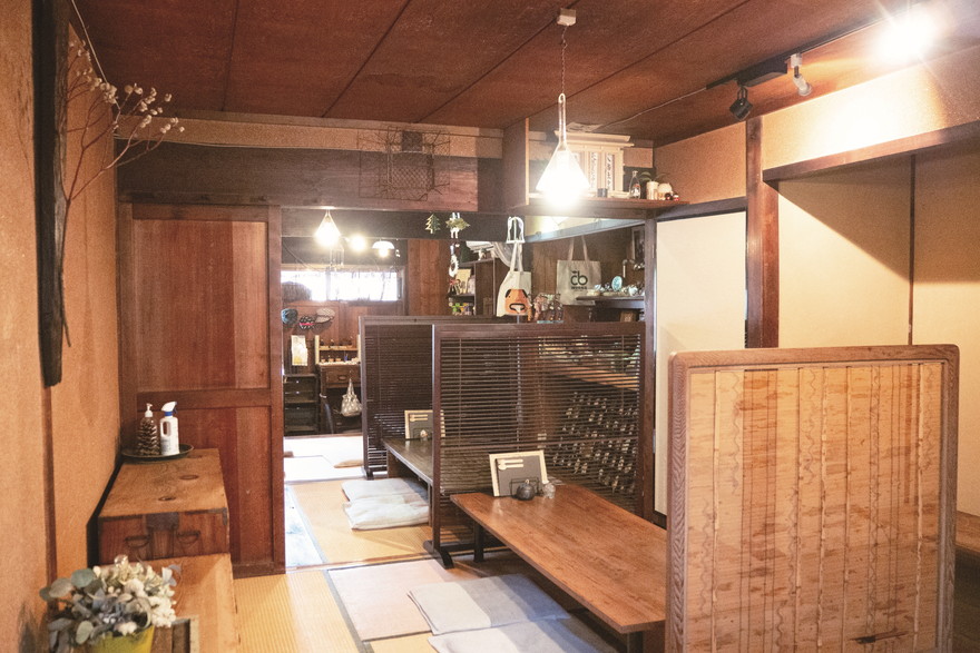 「勝川駅前通商店街」内、築90年の建物をリノベーションした風情ある古民家シェア店舗「TANEYA(たねや)」1階にある、心安らぐ雰囲気のお店が「カフェ 百時(ももとき)」です。