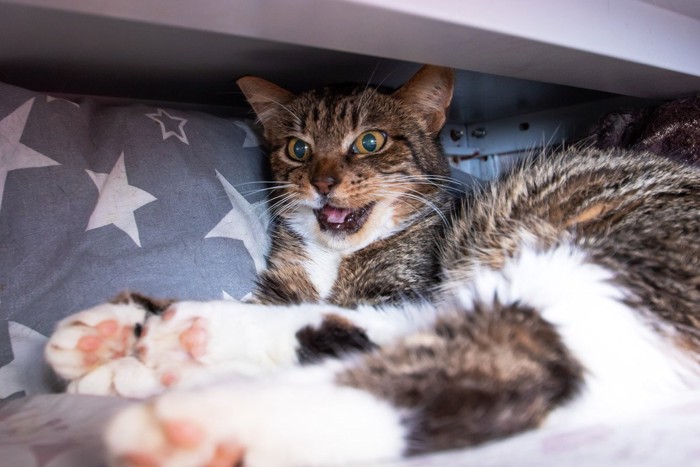 この時の鳴き声は不安を訴えるような、いつもより低く短い声になりがち。落ち着きなくうろうろしたり、隠れようとしたり、耳を伏せたり、瞳孔が開いたりするなどの不安のサインを同時に見せるときもあります。
