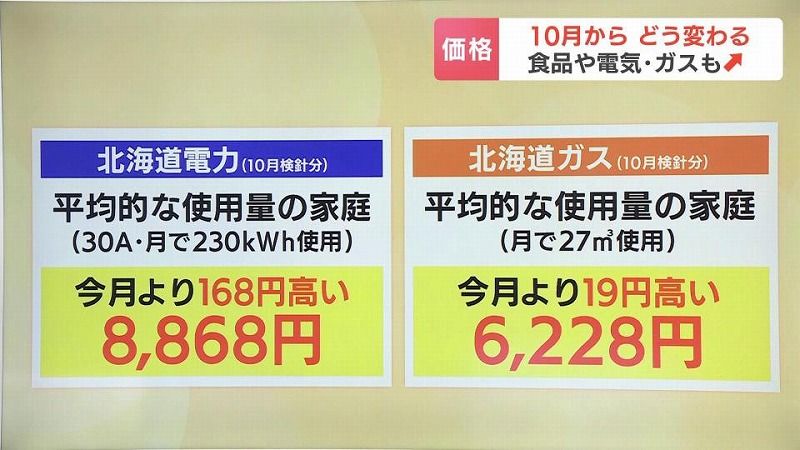 北海道電力は、10月検針分から平均的な使用量の家庭で、9月より168円高い8868円に。