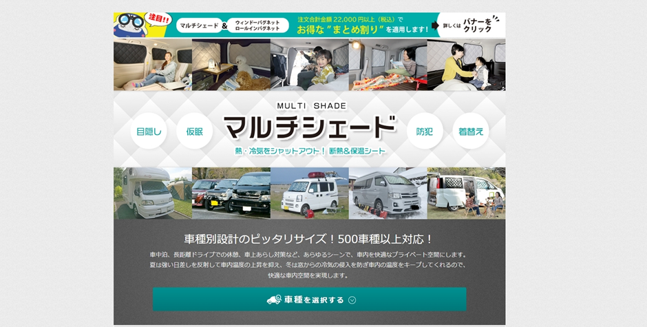 アイズの「マルチシェード」は、車種別専用設計の高断熱サンシェードで、500車種以上に対応しています。