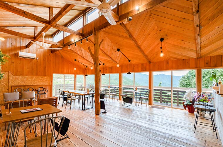 ウッディーな店内は大きな窓から光が差し込み、開放感と落ち着きがある空間。4人テーブルやソファ席など全16席に加え、山並みを望むテラスは6席あり、ペット同伴OK。景観を眺めながら、ゆったりと過ごすことができます。