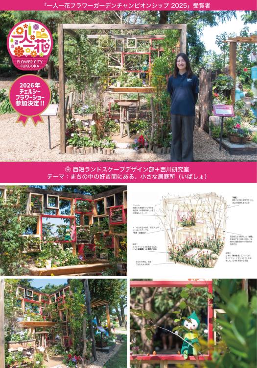 『西短ランドスケープデザイン部+西川研究室』の作庭コンセプトは、再開発で大きく、直線的な建築物が並ぶ今の福岡というまちの中に、好きなことに没頭できる「好き間(隙間)」を創り出し、誰もがホッとできる「小さな 居庭所(居場所)」を生み出すこと。