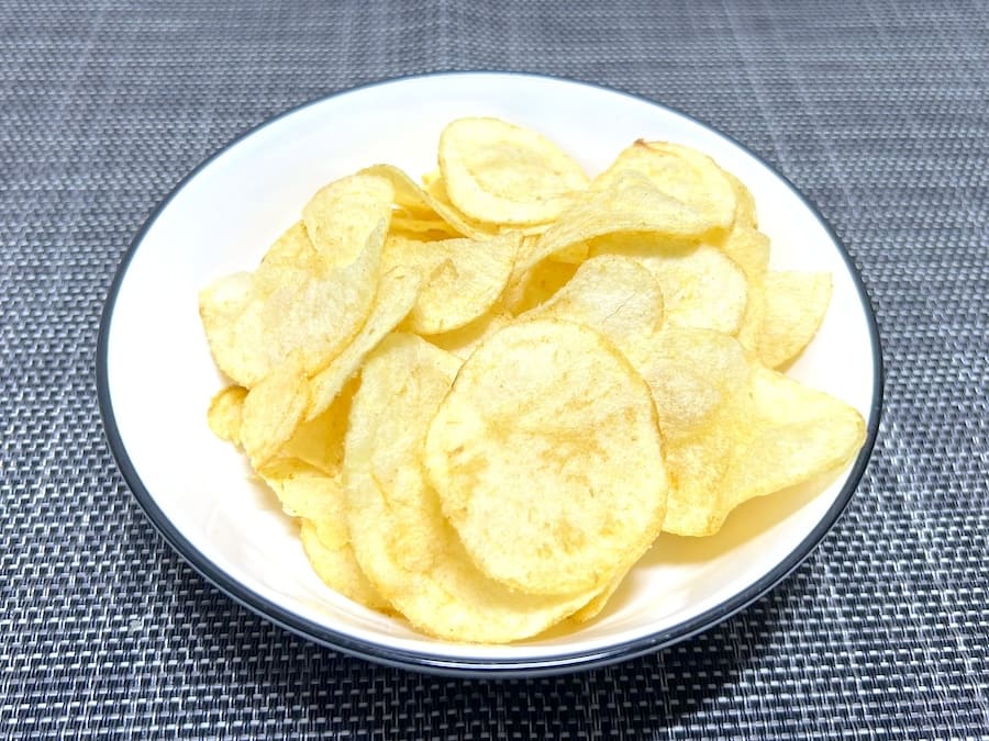 お皿に開けてみれば、見た目の特徴は特になし。薄い色合いの、よくあるポテチ。