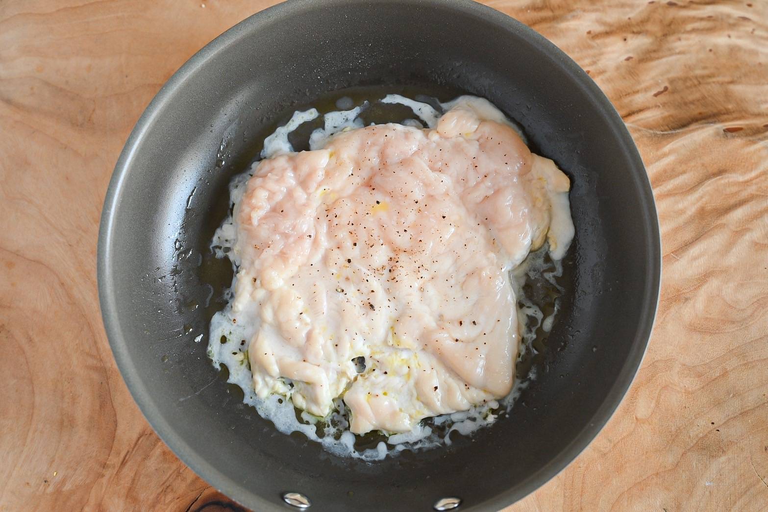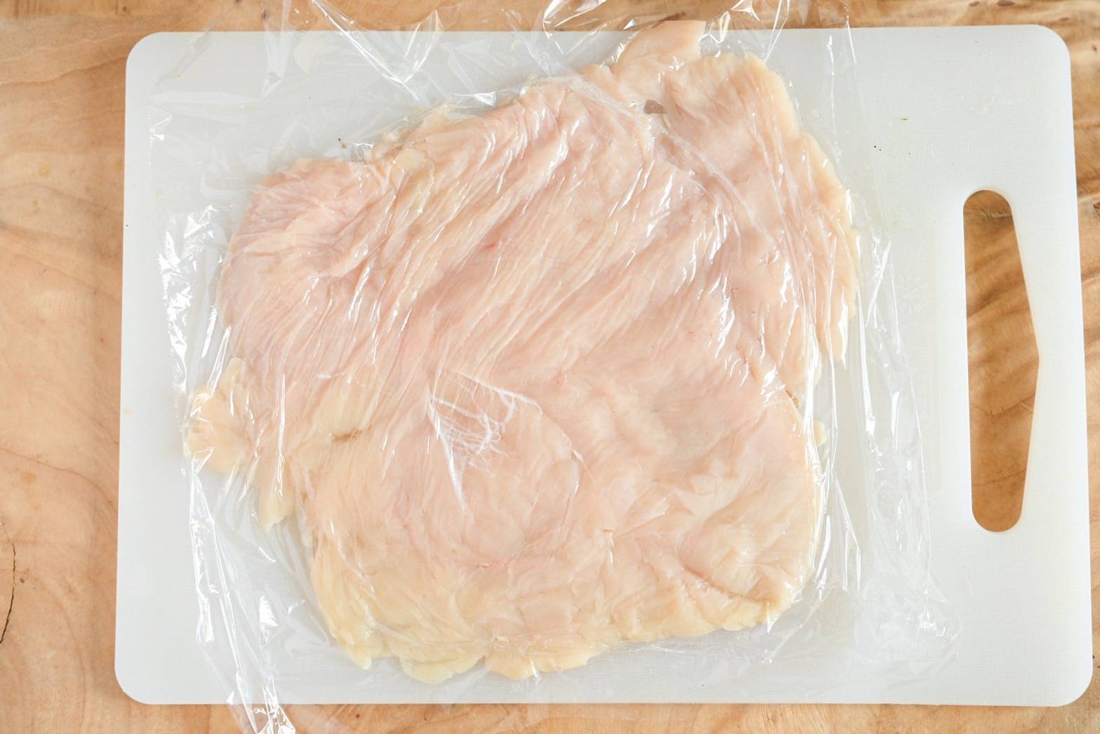 鶏肉は厚みがあるところをそぐようにして開き、ラップをのせ、めん棒でおよそ倍の大きさになるまで叩いて薄くします。