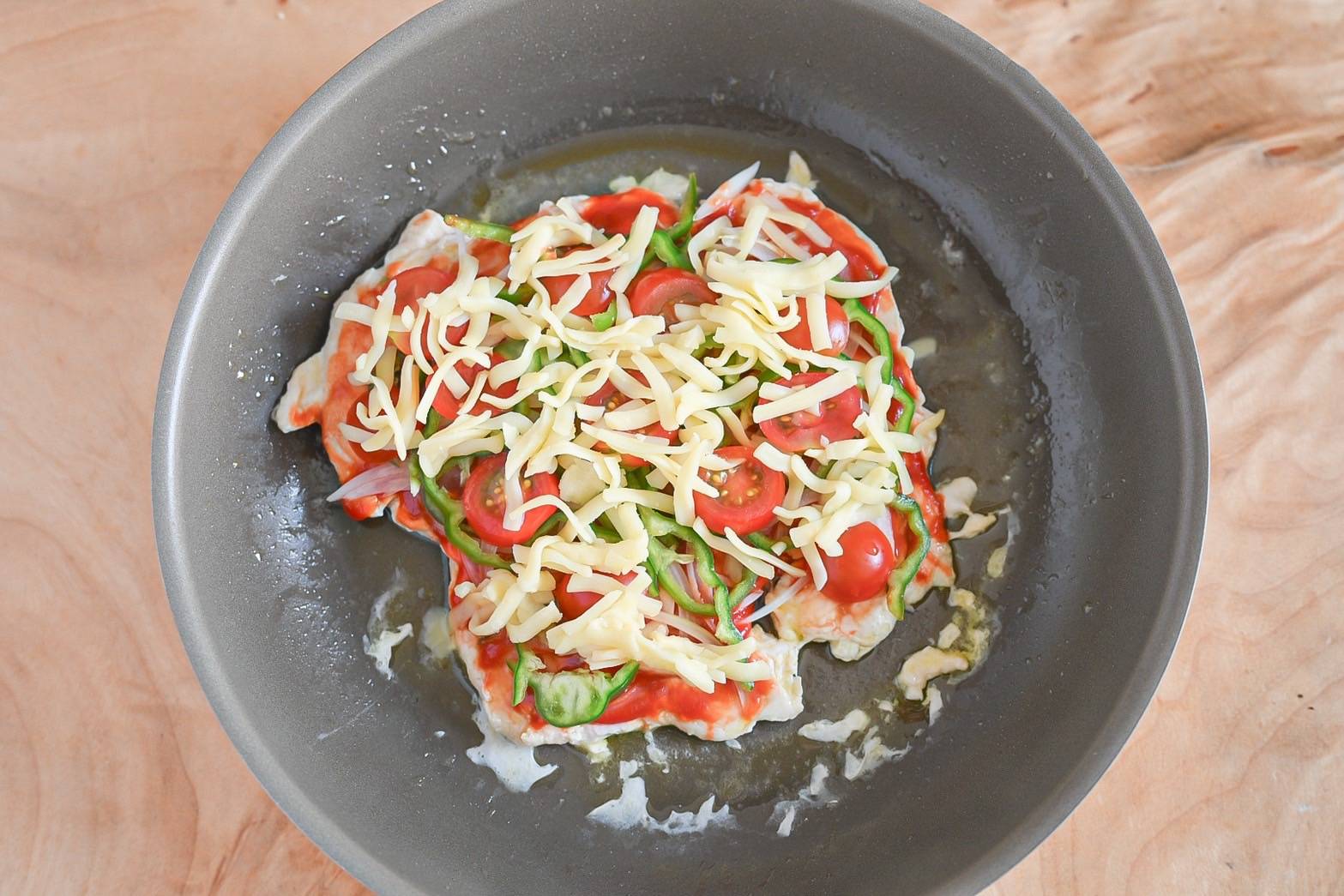 鶏むね肉を上下返し、オリーブオイル小さじ1杯をフライパンに沿って流し入れます。火を止め、ケチャップを塗り、玉ねぎ、ピーマン、ミニトマトをのせてとろけるチーズを広げ入れます。