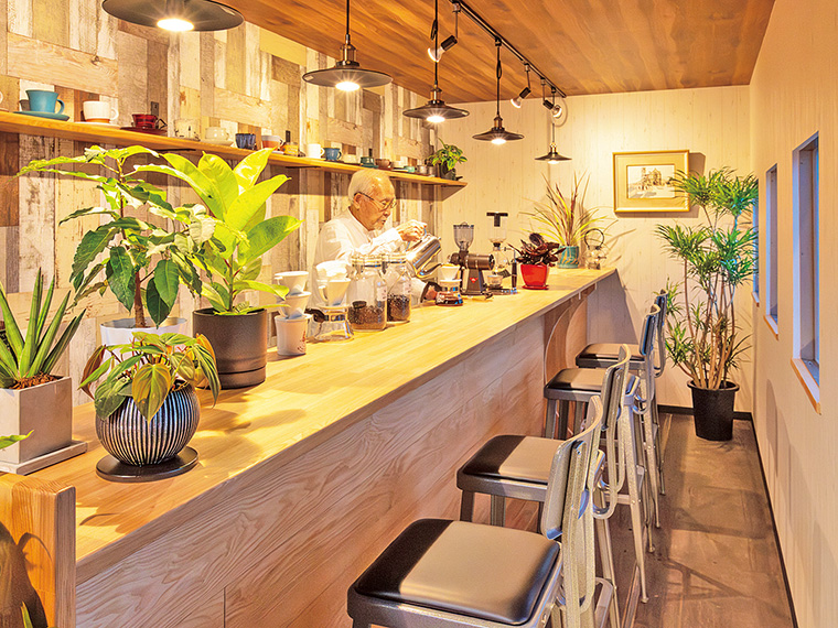 造園業を営む傍ら、50年来のコーヒー愛好家でもある紺野仁昭マスターが、燻すようにやさしく引き出した1杯は格別。芳ばしい香りに包まれながら、好きなカップを選んで味わえる。