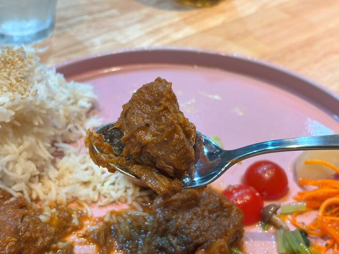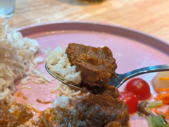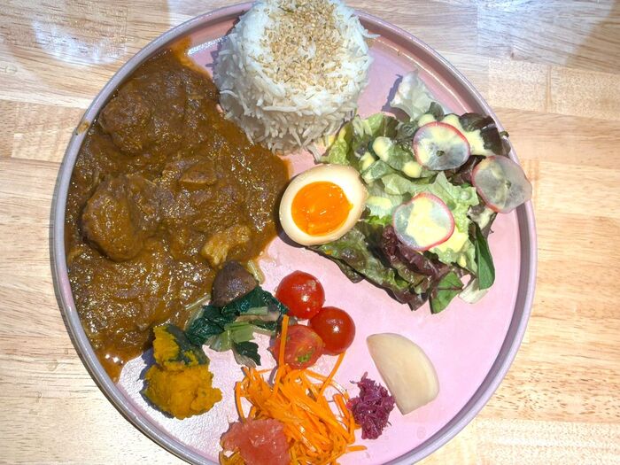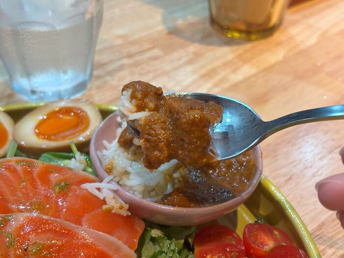 カレーはスパイスの深み、そして食材のコクや甘みを感じられる、優しくも刺激的な味。