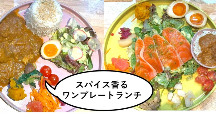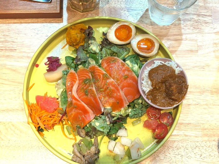 ワンプレートにカレー、サラダ、副菜が盛り付けられています。