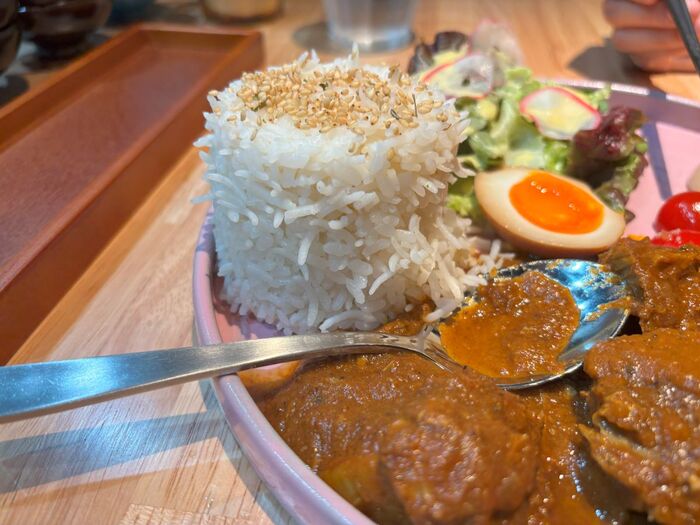 ご飯は、細長いインディカ米と日本人に馴染み深いジャポニカ米がブレンドされています。