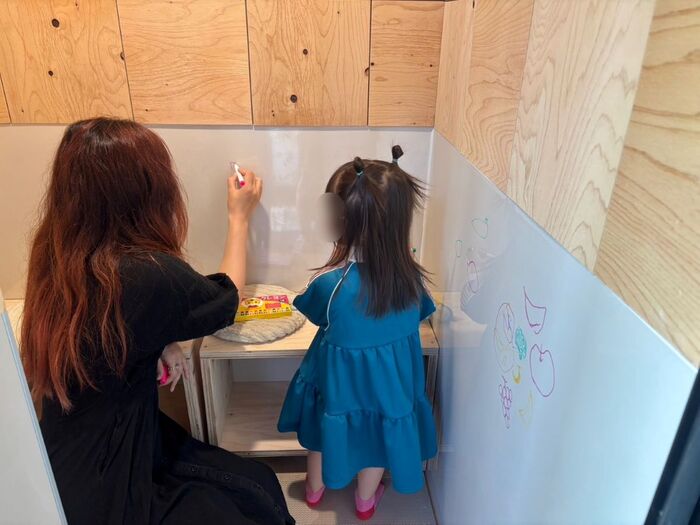 お風呂場だった空間を利用して作られたというこのお部屋は、壁にお絵描きし放題。