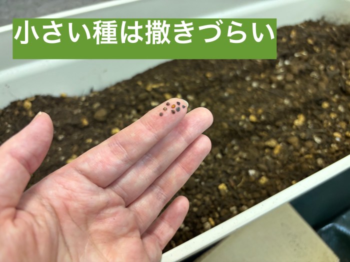 小さい種は背が低めの植物っぽい気がするので、手前側に、間隔をとりながら種まきすることにしたのだが……。
