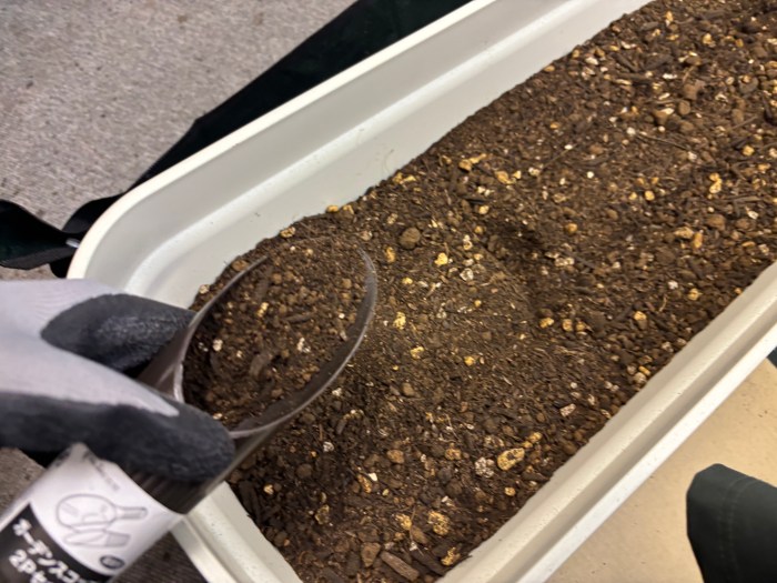65センチの大きめのプランターに培養度と元肥を入れたあと、前後で2列に分けて、ダンボールで線を引いてから種まき開始。