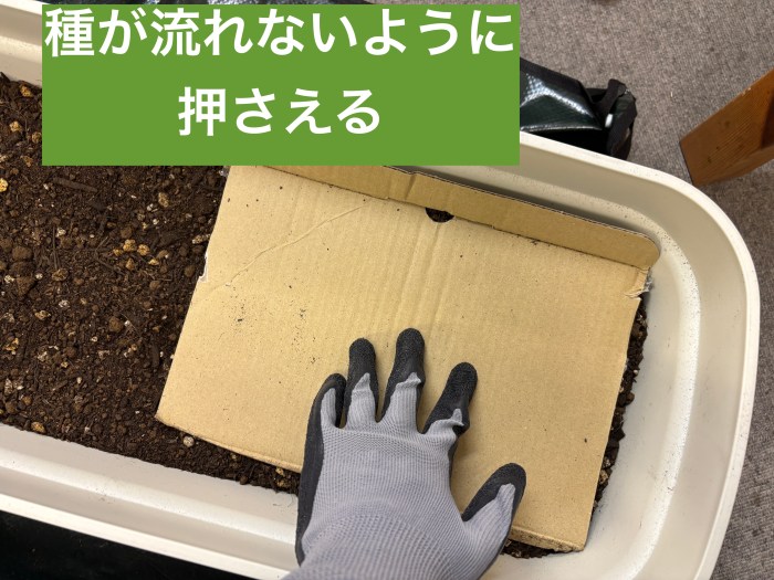 説明書によると、水をまいたときに種が流れていかないように、土を被せた上から板でそっと押さえると書いてあった。