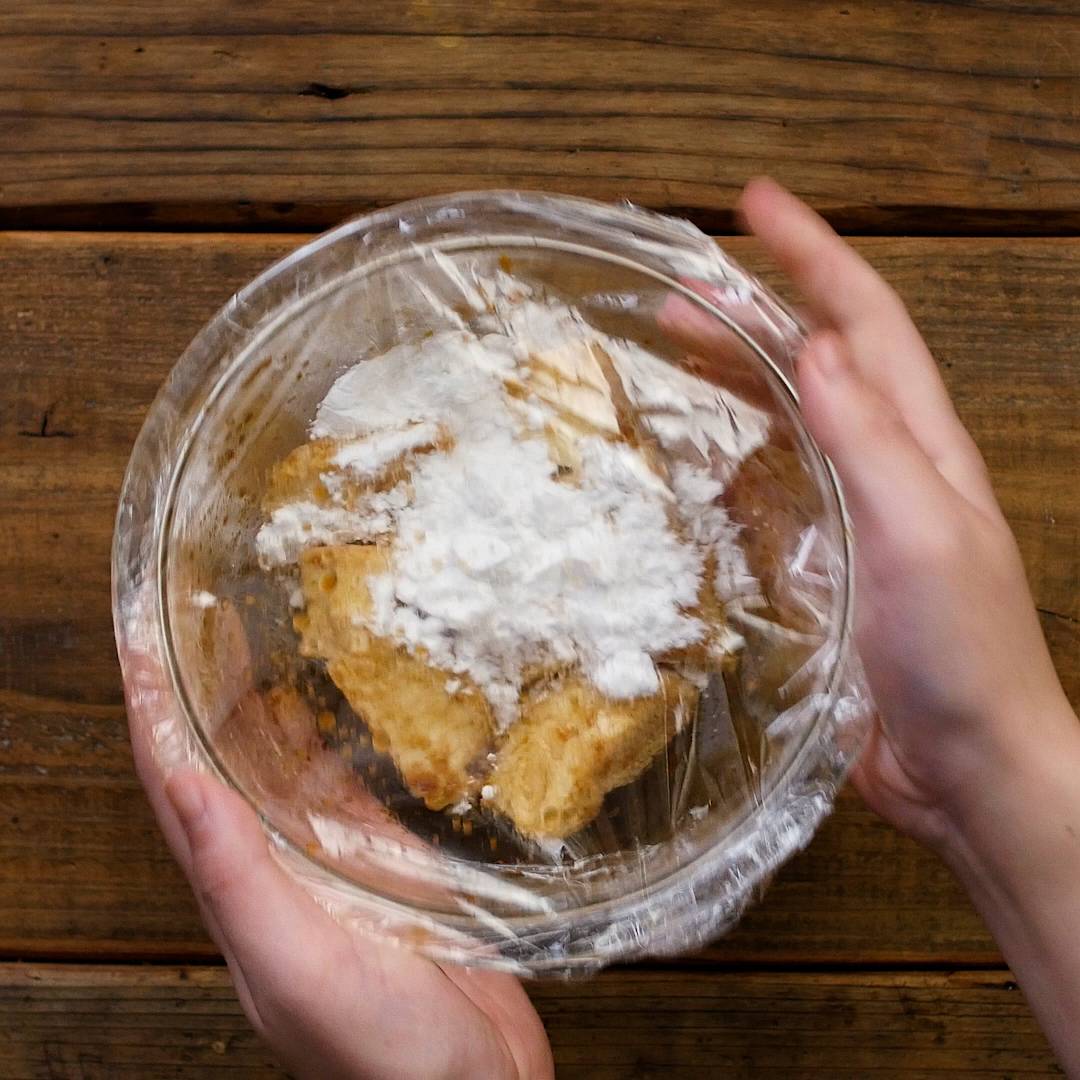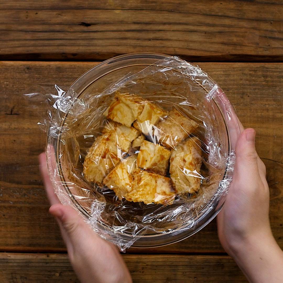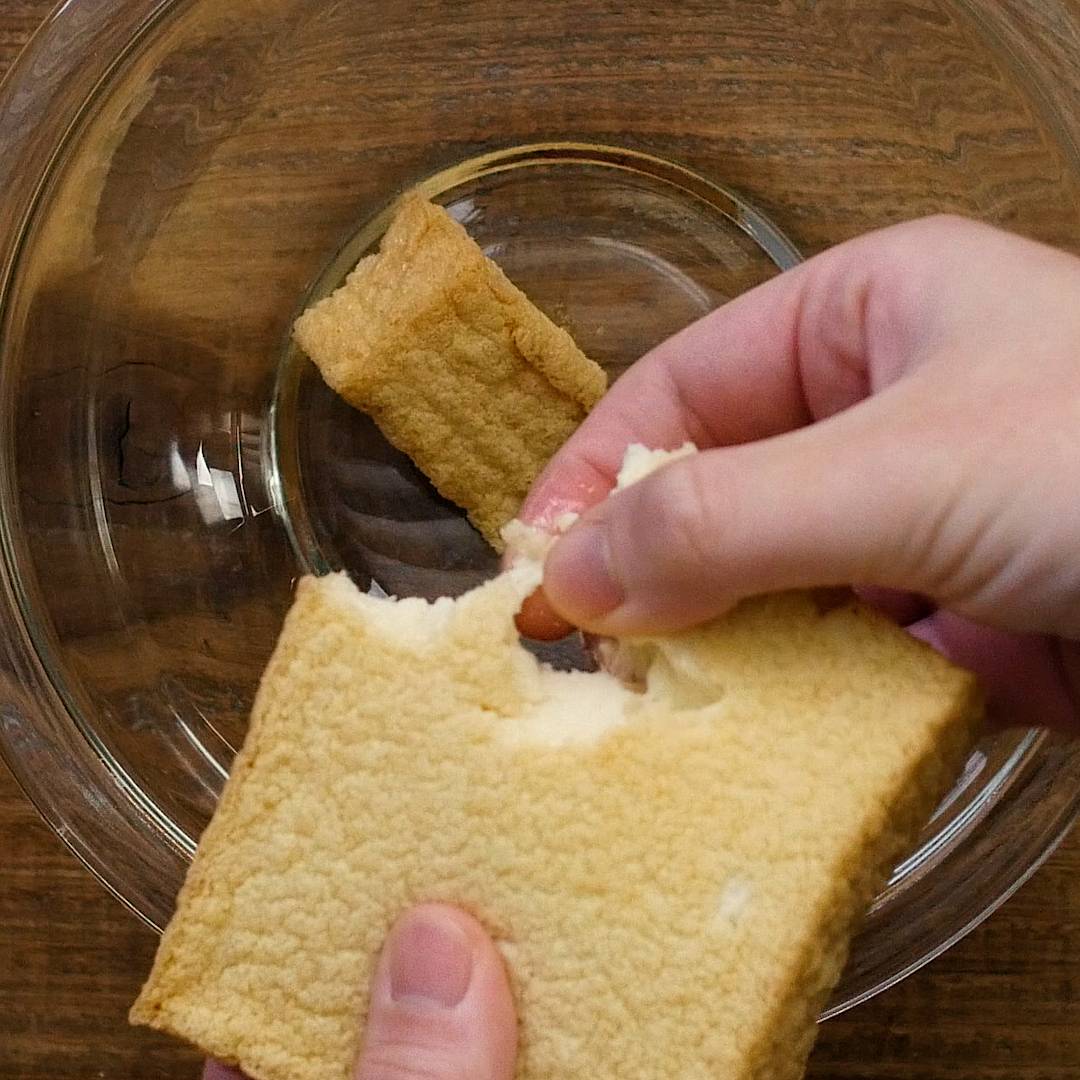 ・厚揚げに熱湯をかけ、ペーパータオルで水気を拭き取ります。