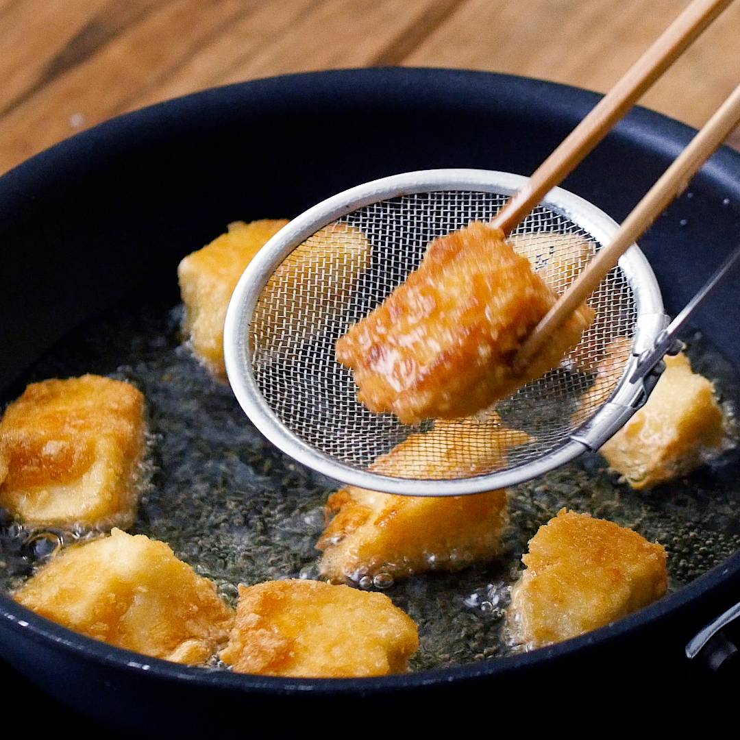 4: フライパンにサラダ油を深さ1cmほど入れて180℃に熱し、③を入れてカリッとするまで揚げ焼きにして取り出します。
