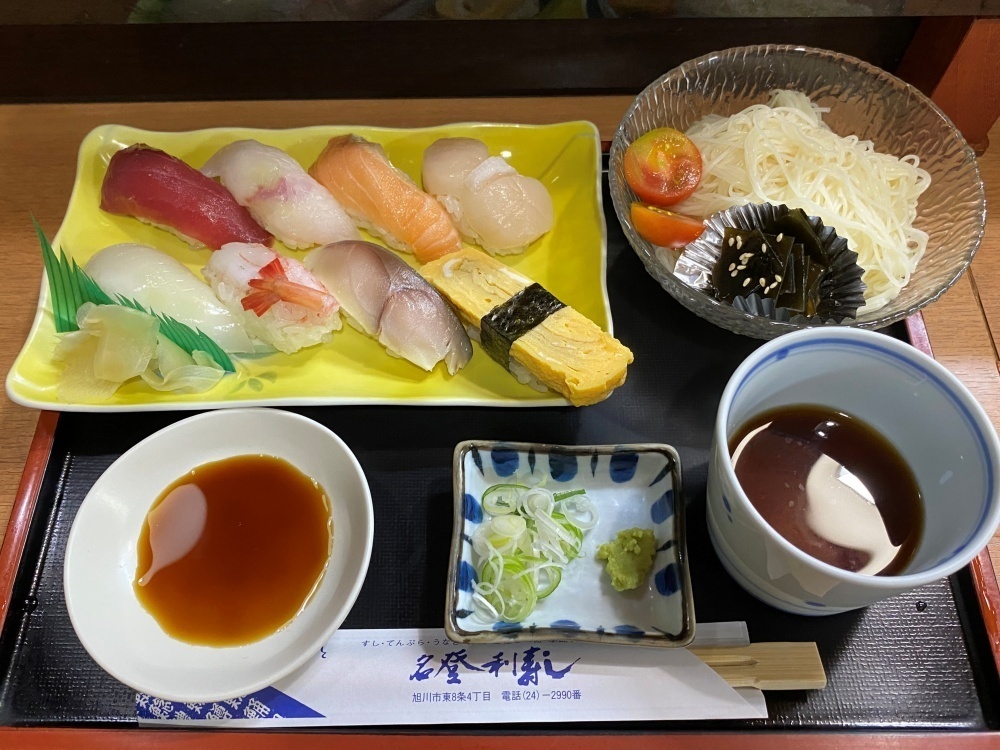 お寿司や天丼には、そうめんが付いています。お店に行ったのが8月下旬だったため、冷たいそうめんで、麺の下には氷が敷かれていて、とても冷たくさっぱりと頂けました。