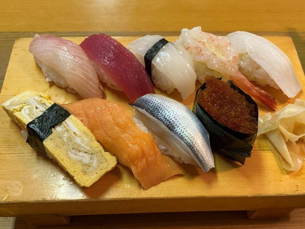握りは、マグロやサーモン、イカ、甘えび、とびっこなど9貫です。