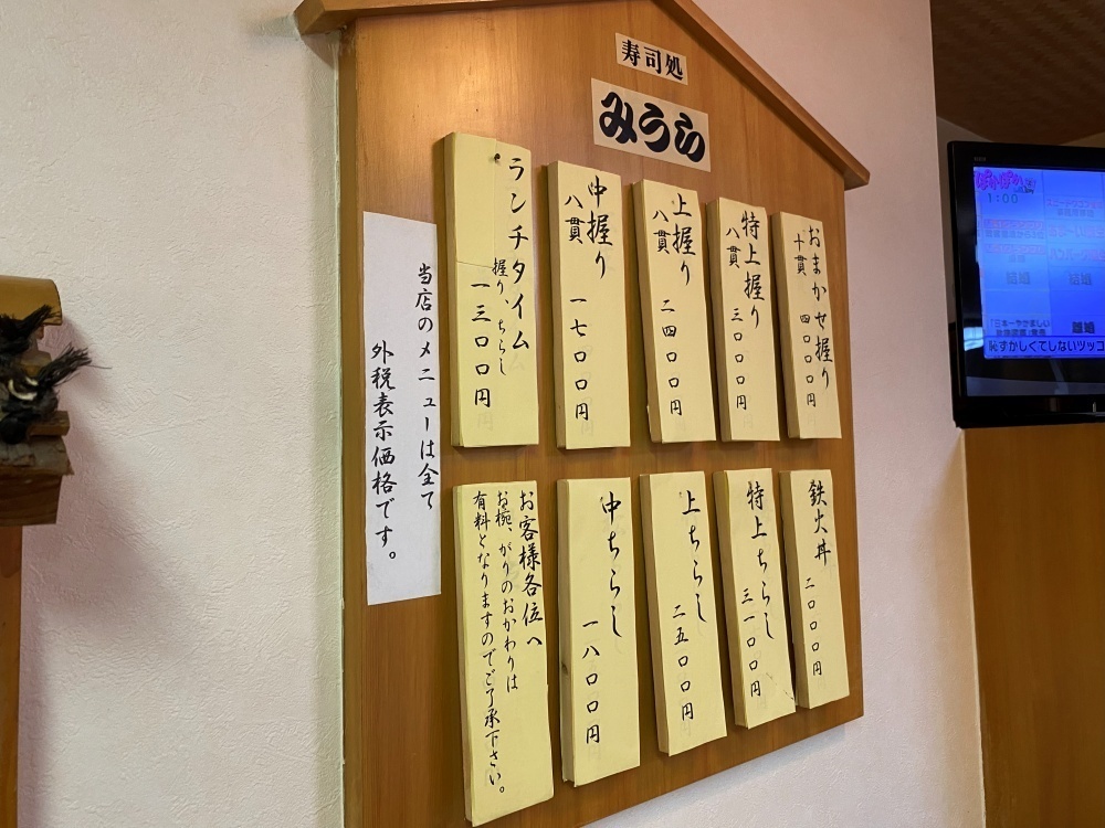 ランチタイムのメニューは、握り寿司とちらし寿司の2種類でどちらも1,300円です。