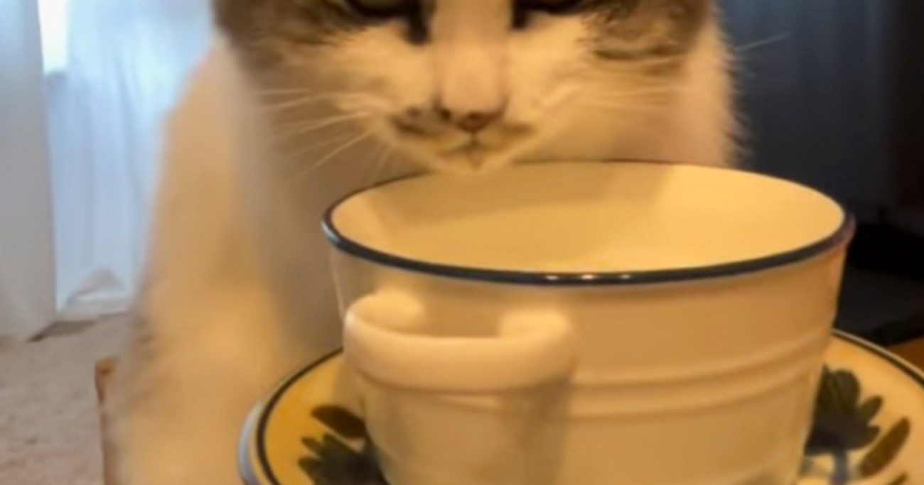 『ティーカップに入った水を飲む猫』の様子を見てみると…まさかの『衝撃的な顔』に笑っちゃう人が続出「圧が凄いw」「真剣すぎて可愛いw」