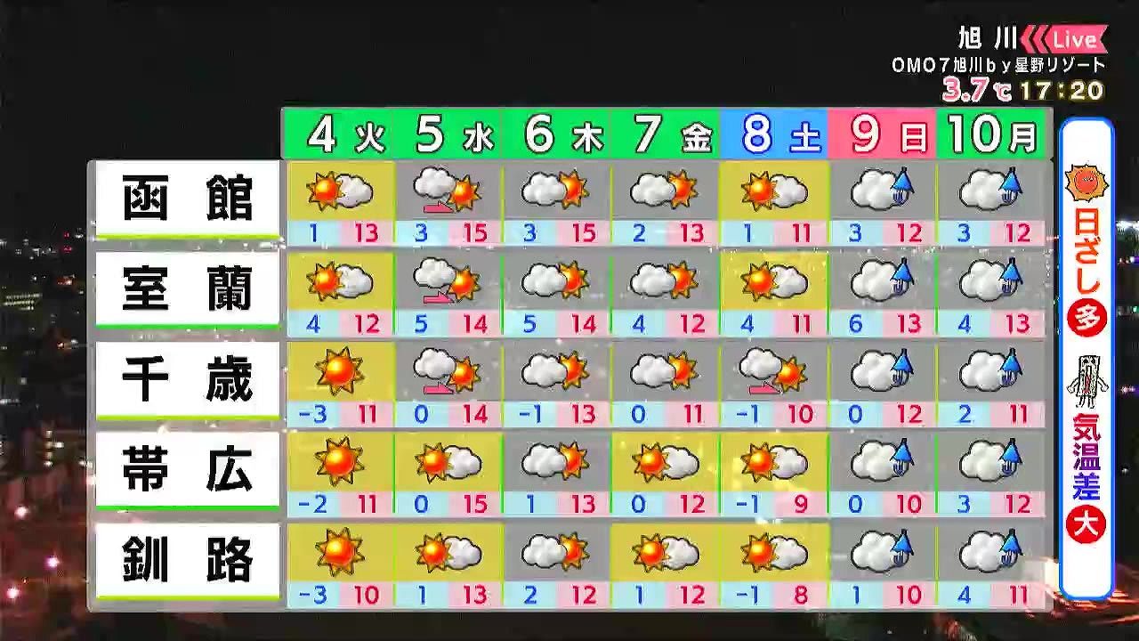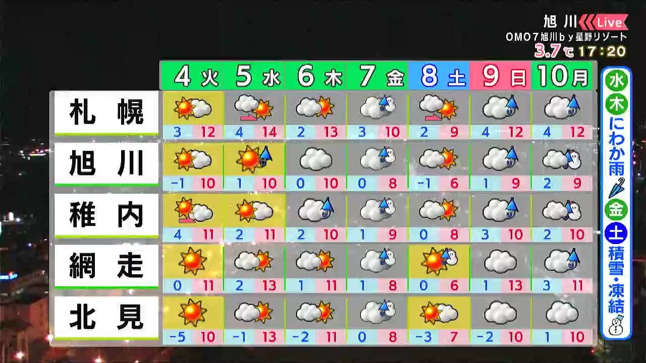 あす4日(火)夜から水曜の朝にかけて日本海側でにわか雨、木曜の日中も道北で雨の降る時間がありそうです。金曜は札幌や旭川など平地でも雪が降り、路面状況の変化に注意が必要です。