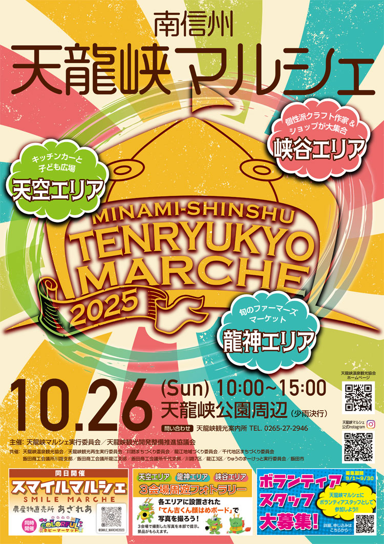 長野県飯田市「天龍峡公園」周辺で『南信州 天龍峡マルシェ』が2025年10月26日(日)に開催。今年は、約40店の新鮮な野菜や果物、三遠南信の特産グルメやキッチンカーが並ぶ「天空エリア」、「龍神エリア」や約100店の工芸品や雑貨、骨董、飲食などが揃う「峡谷エリア」の3会場で展開。フード、ファーマーズマーケット、クラフト、体験イベントなど一度に楽しめる天龍峡エリア最大級の秋のイベントです。