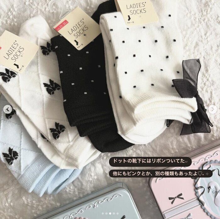 cccc.ouchiさんは、セリアで「レディースソックス クルー丈」をまとめ買い。ドット柄の方は、足首の後ろ側にふんわりとした素材のリボンが付いているようです。 リボン柄の方はラインが立体的で、上品さが感じられますよね♪