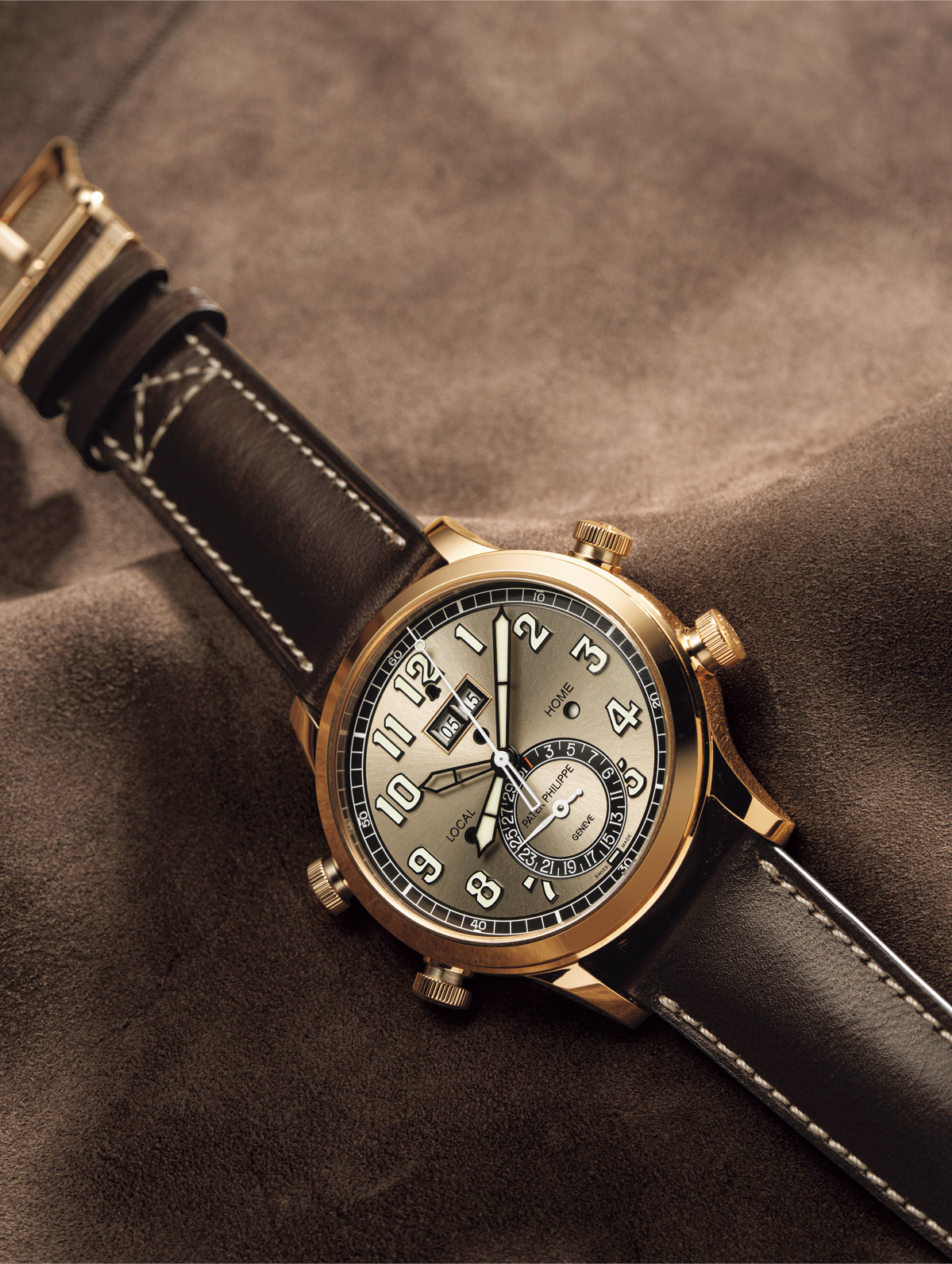 「アラーム」は、奏でる音で任意の時間の到来を知らせる機構。パテック フィリップでは、ローカルタイムとホームタイムを機能的に表示する「トラベルタイム」と組み合わせることで、便利な旅の時計に仕上げている。